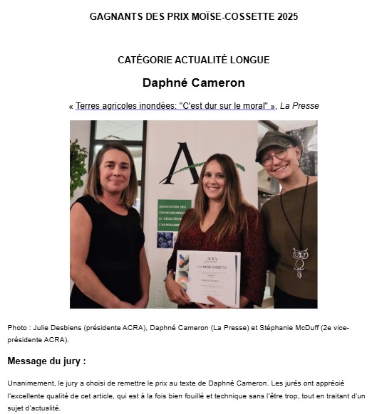 Les prix Moïse-Cossette couronnent les communicateurs de l’année dans le secteur agroalimentaire. Ils récompensent la qualité de l’information et du français, l’effort de communication, l’originalité et la pertinence du sujet traité dans les œuvres présentées au concours.