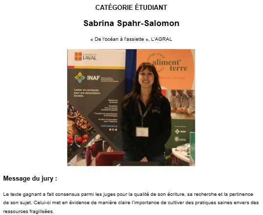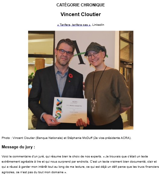 Le jury des prix Moïse-Cossette était composé cette année de Simon Guertin, communicateur et ex-éditeur du Bulletin des agriculteurs; Hélène Laurendeau, spécialisée en communication en nutrition, alimentation, gastronomie et voyages gourmands; Hélène Raymond journaliste, animatrice et auteure; Pierre Sormany, journaliste, créateur des émissions Découverte et L’épicerie, rédacteur en chef de La Semaine verte et directeur des affaires publiques télé et du module d’Enquête (radio-télé-web) de Radio-Canada; ainsi que Hélène Leroux, ex-rédactrice en chef des émissions Découverte, La semaine verte, L’épicerie et Carbone. Nous les remercions sincèrement de leur grande générosité́.